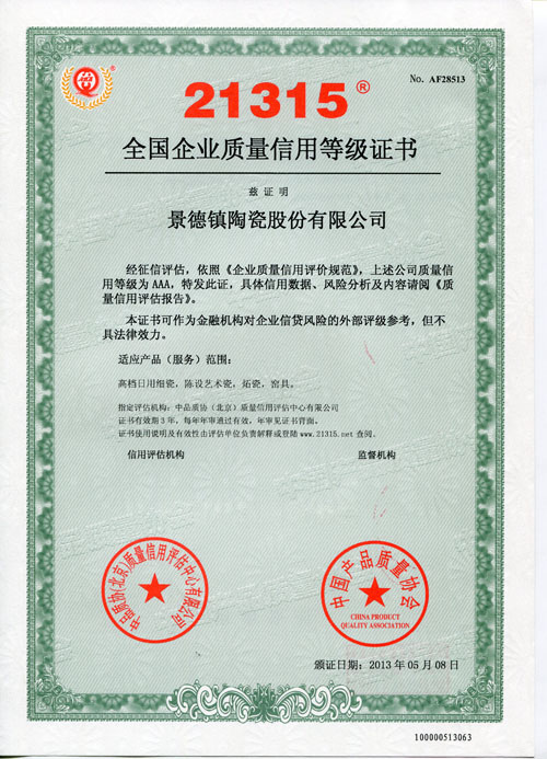 據(jù)了解,榮獲《中國21315質(zhì)量信用等級(jí)AAA級(jí)證書》的企業(yè)可在網(wǎng)站系統(tǒng)上進(jìn)行查詢。質(zhì)量信用等級(jí)從AAA到D共有10個(gè)級(jí)別,AAA級(jí)是質(zhì)量信用等級(jí)的最高級(jí)別,意思是產(chǎn)品質(zhì)量信用“非常好”。