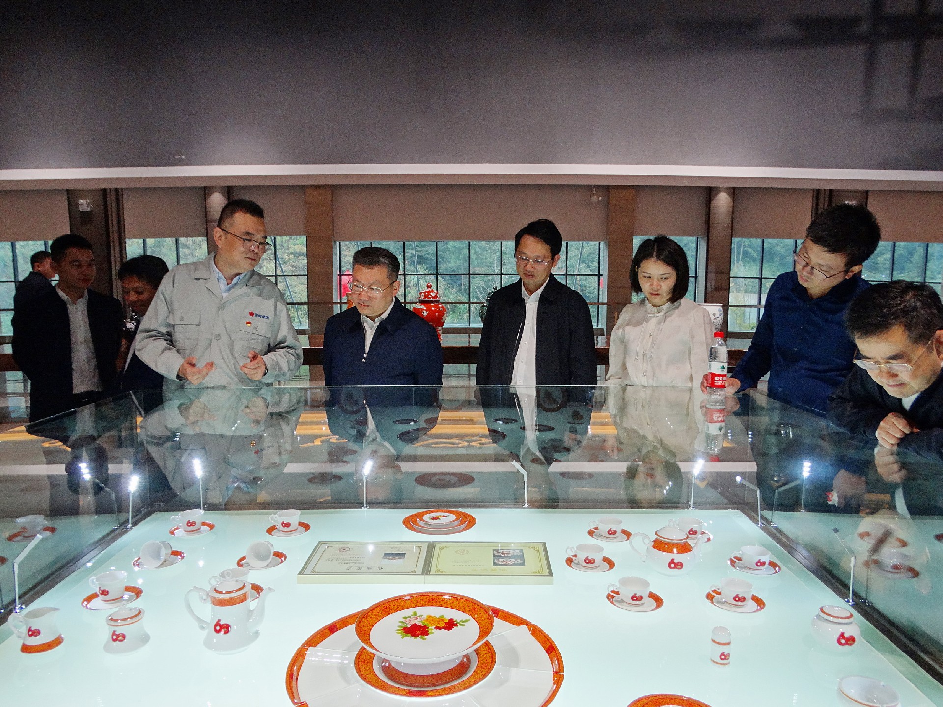 在國瓷館,胡軼向陳澎一行講解國瓷館內(nèi)的基本情況和產(chǎn)品特色。大家一路走一路看一路聽,胡軼向重點(diǎn)介紹了“新中國成立60周年國慶慶典天安門觀禮臺(tái)專用瓷”、“‘瀛臺(tái)夜話’接待外國元首用瓷”、“古典園林”、“首長專列用瓷”等。一個(gè)個(gè)國瓷故事和工藝細(xì)節(jié),引得眾人贊嘆不已。陳澎還仔細(xì)詢問了企業(yè)生產(chǎn)經(jīng)營、對外貿(mào)易等情況。