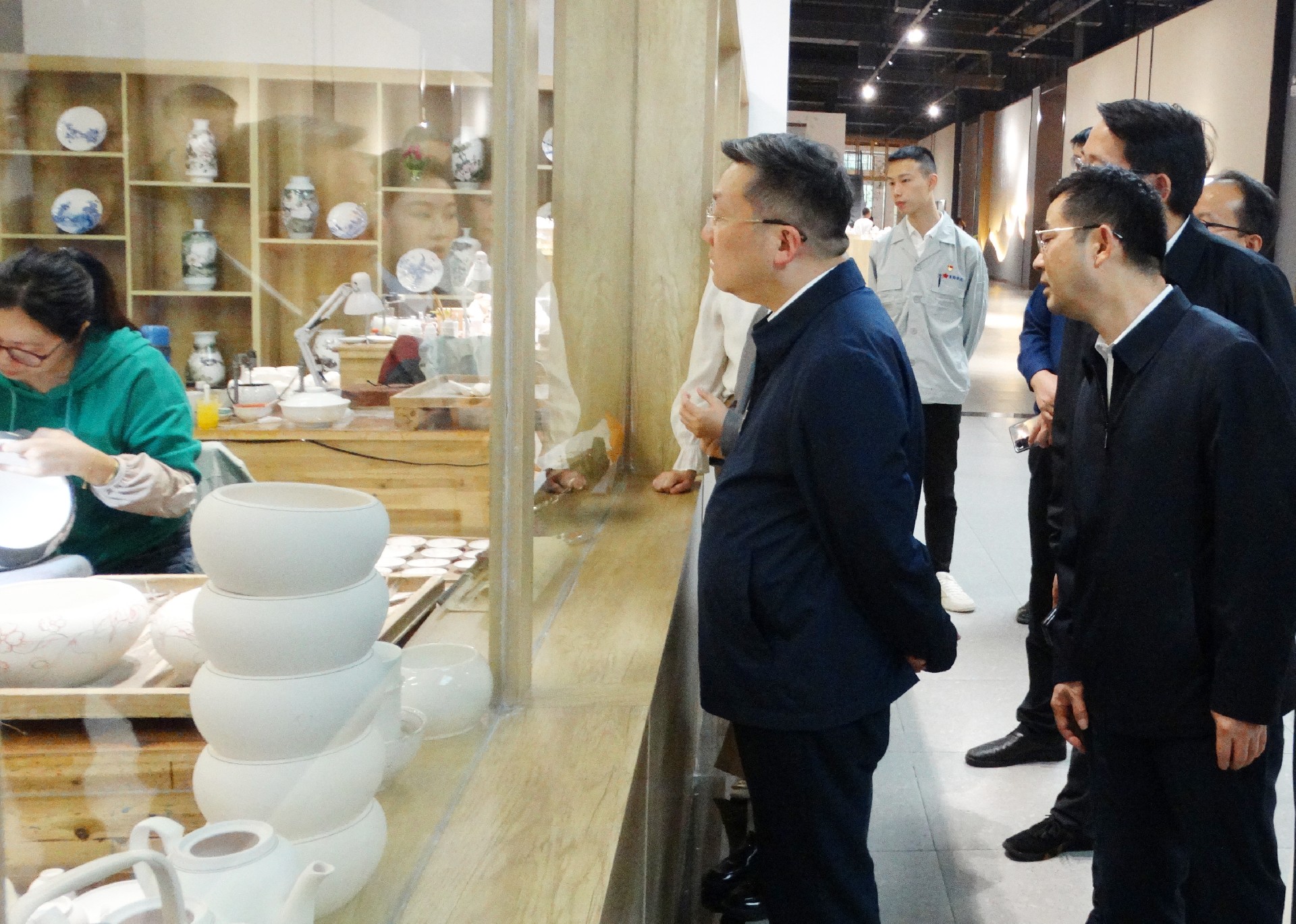 在繪畫展示窗口,工人們正聚精會(huì)神地繪制碗、盤等器皿。陳澎饒有興致地觀看,并連連稱贊她們的技藝,胡軼隨即說道,我們集團(tuán)對專業(yè)技術(shù)人才非常重視,還相繼出臺(tái)了一系列激勵(lì)措施,陳澎聽后給予了高度肯定和稱贊。