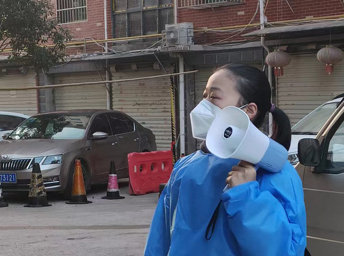 在這場沒有硝煙的戰(zhàn)“疫”中,邵建華與邵燕翎既是父女,更是“戰(zhàn)友”。父親每日在現(xiàn)場維持秩序,女兒每天拿著喇叭挨家挨戶的督促居民下樓做核酸,幫助老年人出示核酸碼等工作。父女倆各盡其責、互相鼓勵、并肩作戰(zhàn),用最樸實的行動筑牢疫情防線,他們和大家一樣,希望通過共同努力,早日戰(zhàn)勝這場疫情阻擊戰(zhàn)。