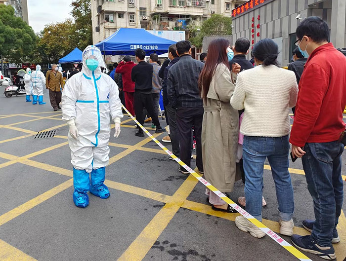 黨員閔愛華,居住在高風險小區(qū)尚東國際。她每天四點鐘就起床,挨家挨戶地上門為居民做核酸,衣服被汗水浸透仍堅守在防控一線,只為疫情能夠早日清零。